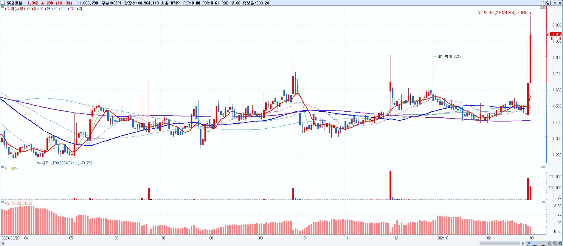 - SG글로벌 (1,942원 ▲ 18.13% , 시총: 873억, 거래량: 11,682,903, 거래대금:222억)