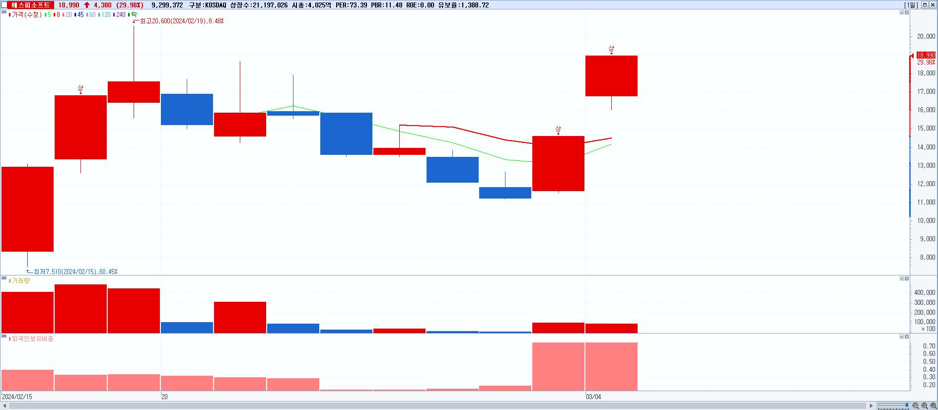 - 에스피소프트 (18,990원 ▲ 29.98% , 시총: 4,025억, 거래량: 9,300,887, 거래대금:1,630억)