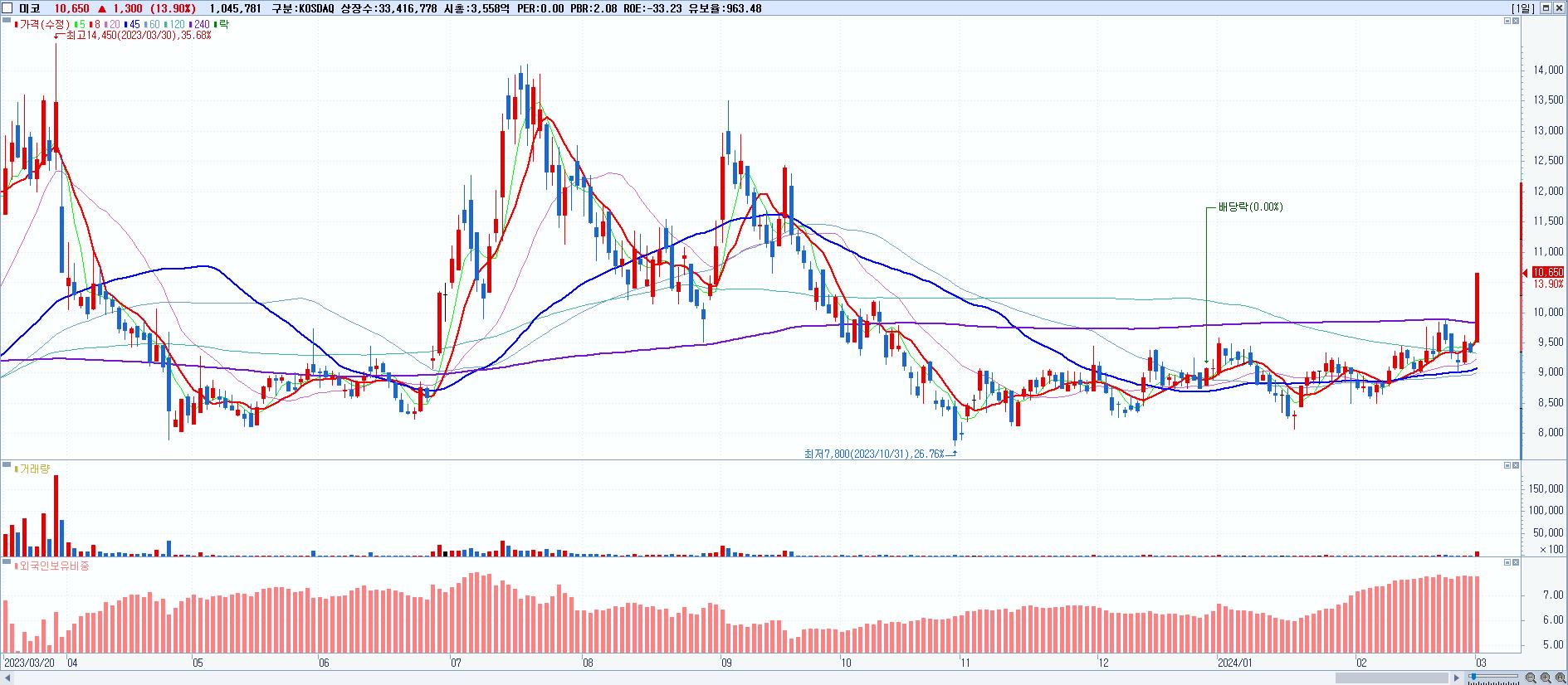 - 미코 (10,650원 ▲ 13.9% , 시총: 3,559억, 거래량: 1,046,527, 거래대금:107억)