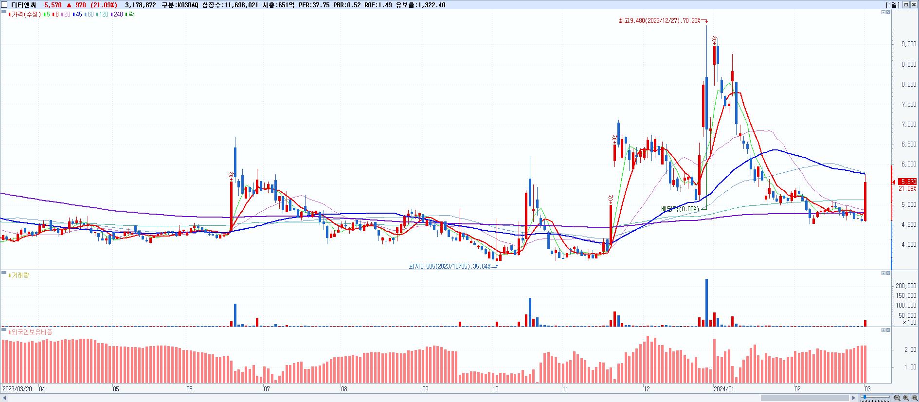 - 디티앤씨 (5,570원 ▲ 21.09% , 시총: 652억, 거래량: 3,181,855, 거래대금:170억)