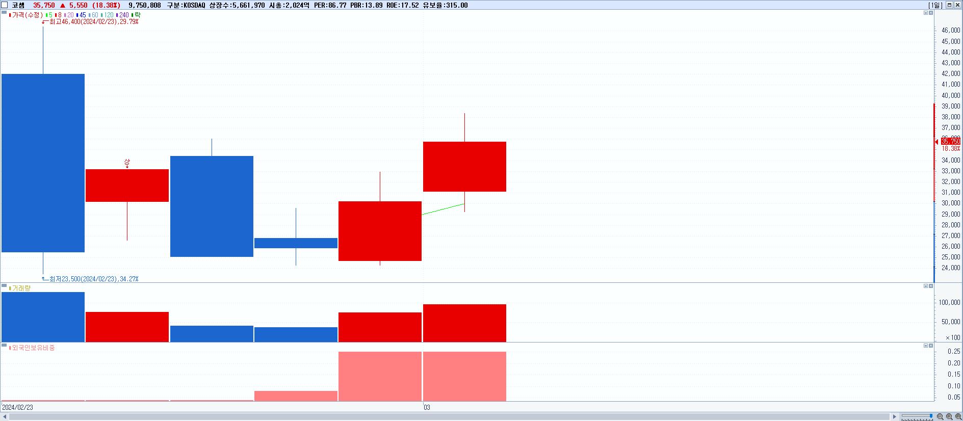 - 코셈 (35,750원 ▲ 18.38% , 시총: 2,024억, 거래량: 9,766,822, 거래대금:3,353억)