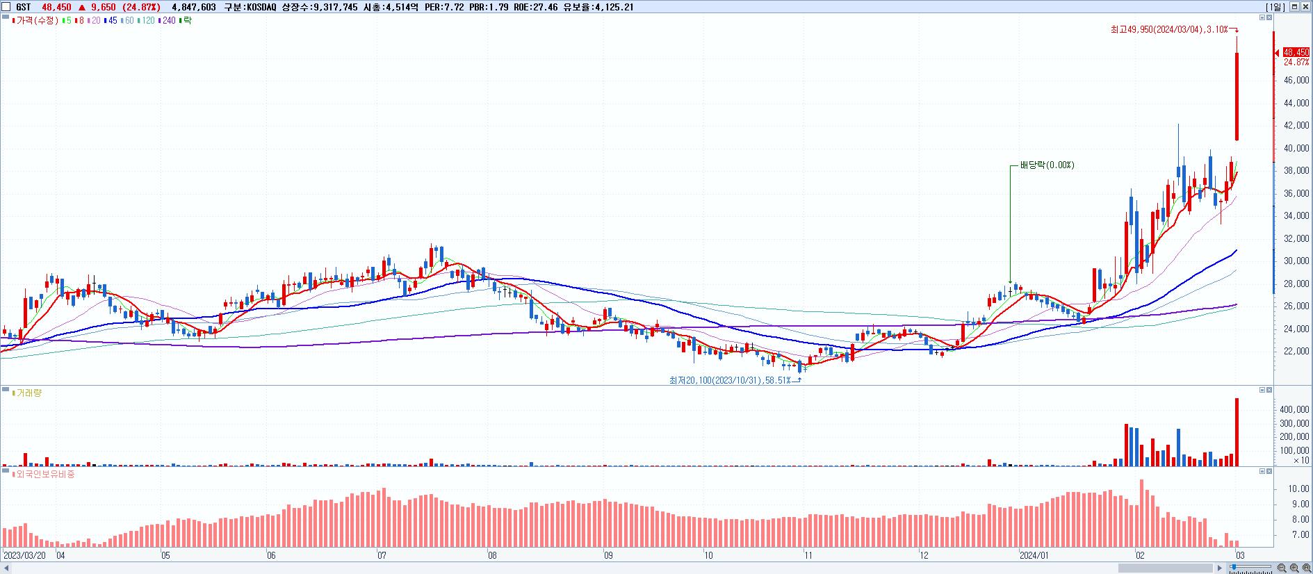 - GST (48,450원 ▲ 24.87% , 시총: 4,514억, 거래량: 4,851,331, 거래대금:2,207억)
