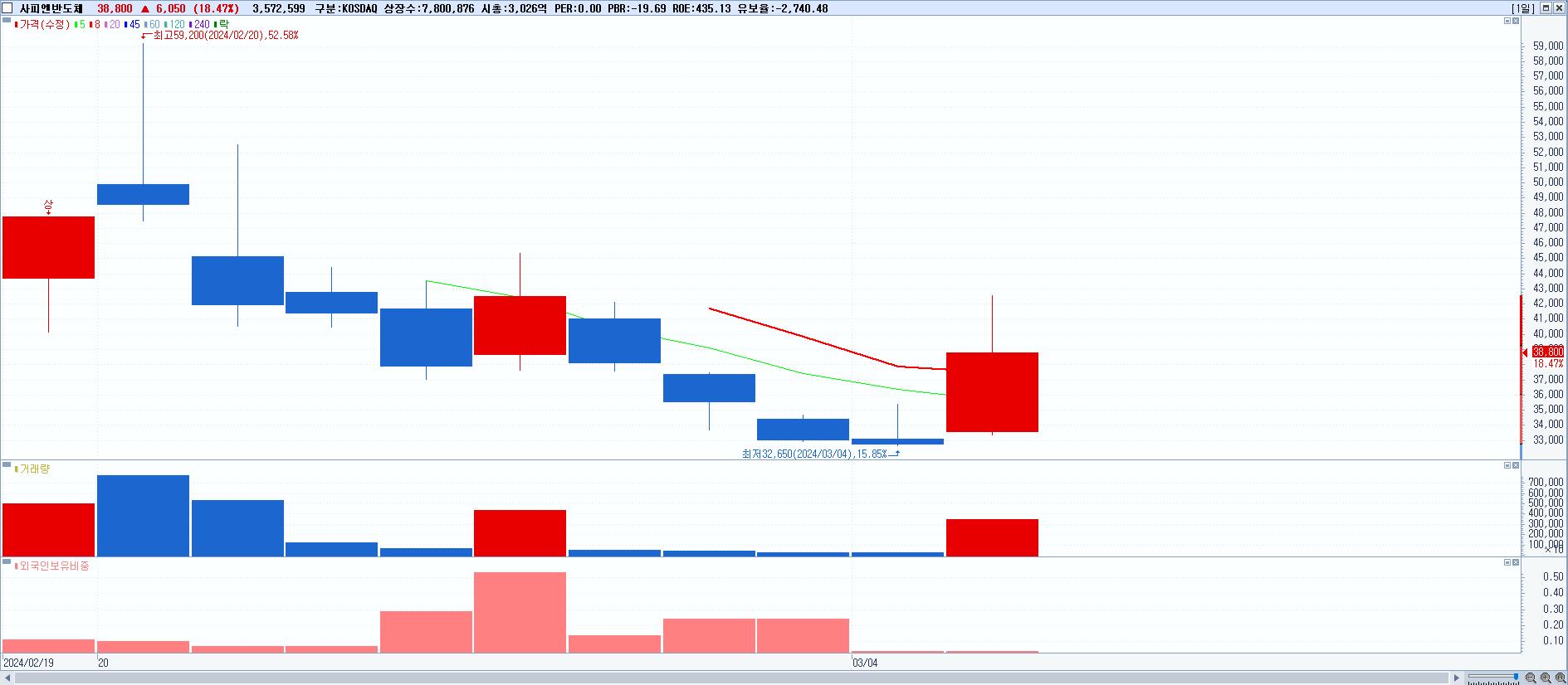 - 사피엔반도체 (38,800원 ▲ 18.47% , 시총: 3,027억, 거래량: 3,572,599, 거래대금:1,413억)