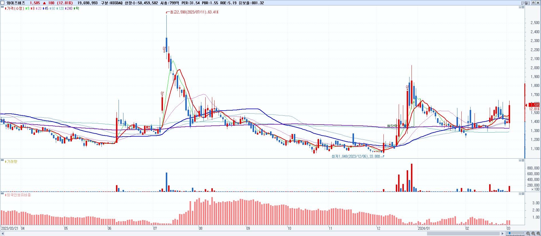 - 와이즈버즈 (1,585원 ▲ 12.81% , 시총: 800억, 거래량: 19,698,993, 거래대금:308억)