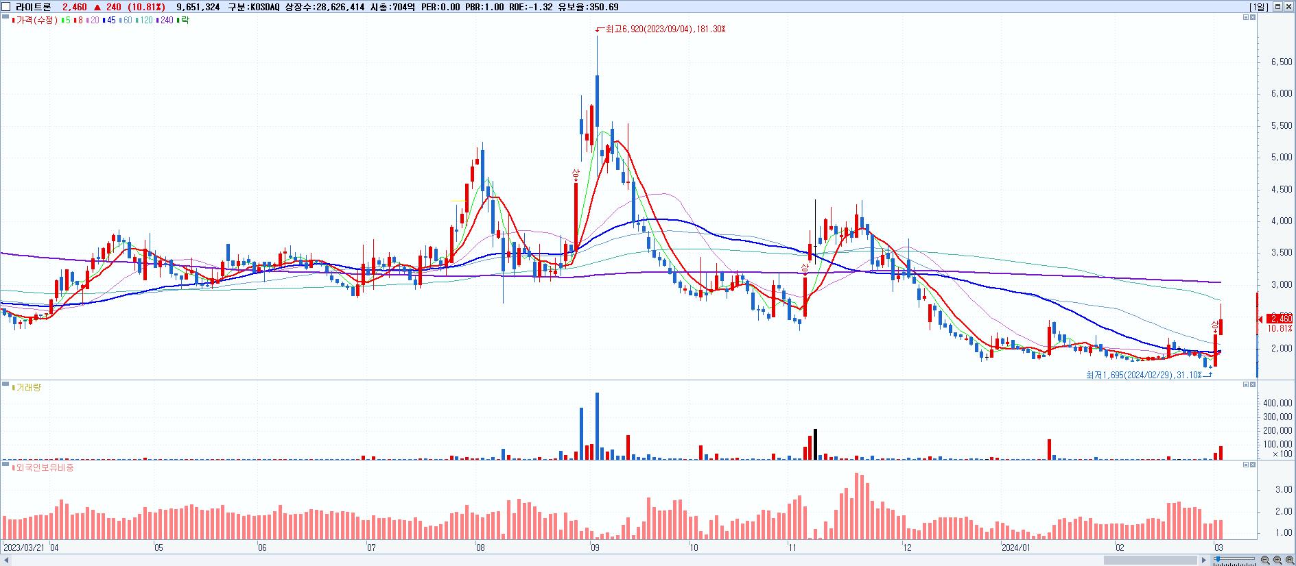 - 라이트론 (2,460원 ▲ 10.81% , 시총: 704억, 거래량: 9,651,324, 거래대금:238억)
