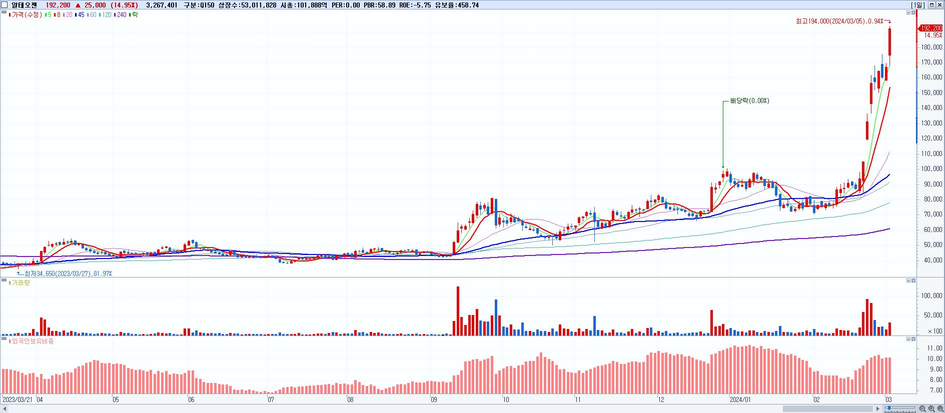 - 알테오젠 (192,200원 ▲ 14.95% , 시총: 101,889억, 거래량: 3,267,401, 거래대금:5,926억)