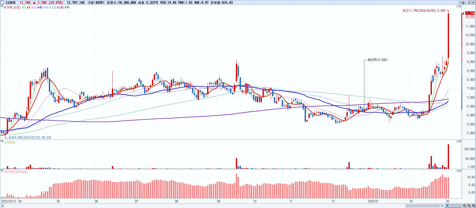 - 디아이 (11,740원 ▲ 29.87% , 시총: 3,322억, 거래량: 12,707,140, 거래대금:1,360억)