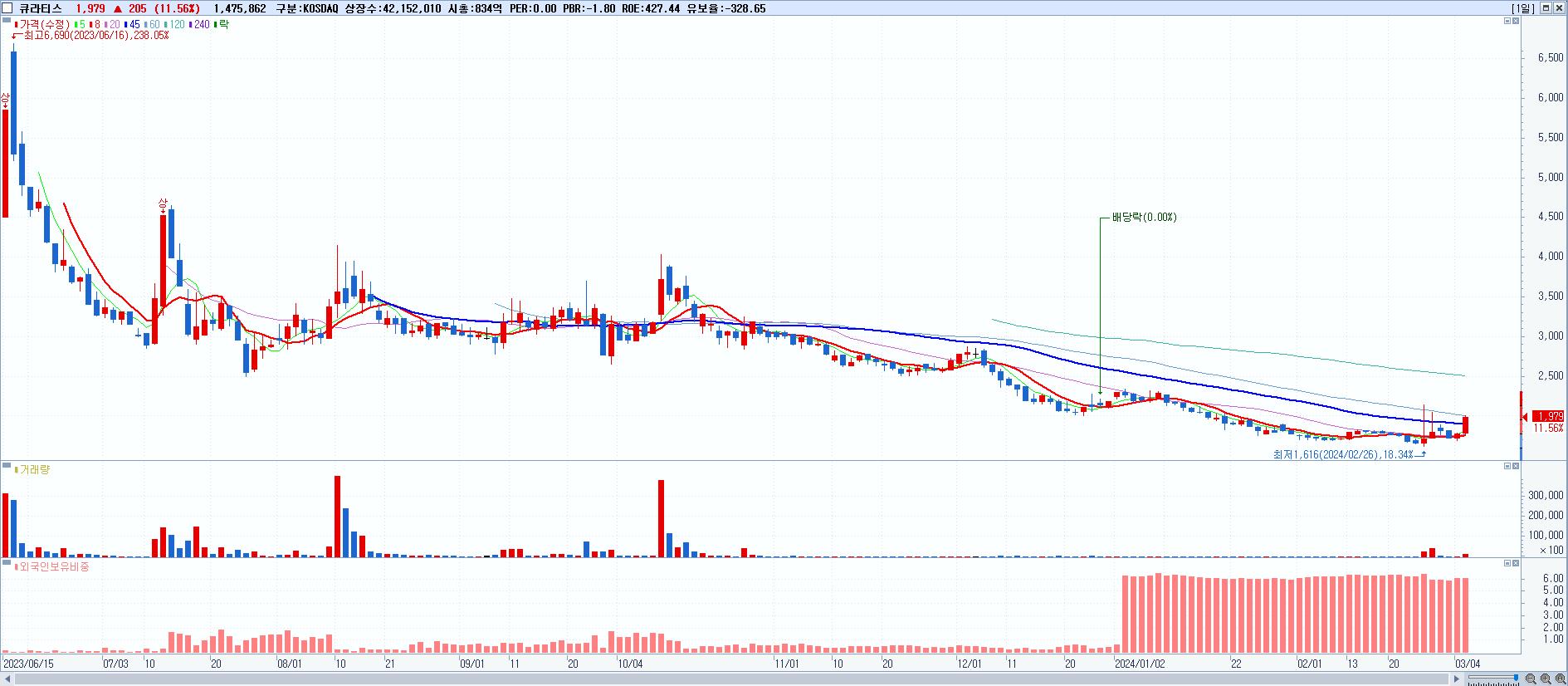 - 큐라티스 (1,979원 ▲ 11.56% , 시총: 834억, 거래량: 1,475,862, 거래대금:28억)