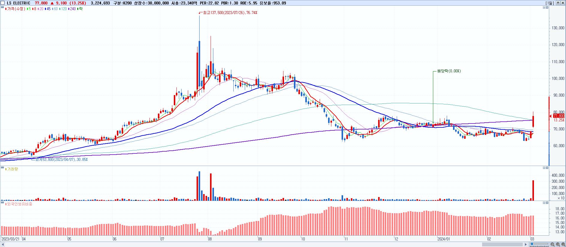 - LS ELECTRIC (77,800원 ▲ 13.25% , 시총: 23,340억, 거래량: 3,224,693, 거래대금:2,479억)