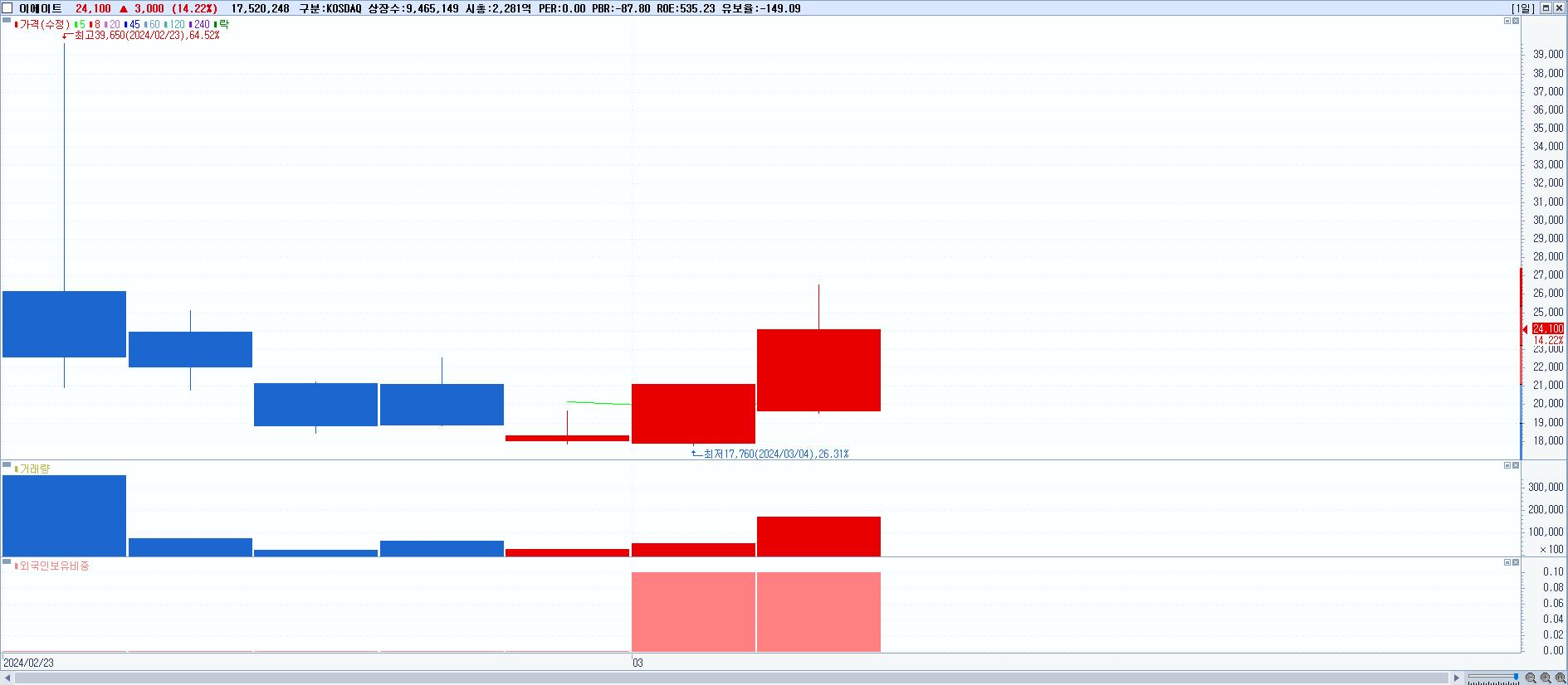 - 이에이트 (24,100원 ▲ 14.22% , 시총: 2,281억, 거래량: 17,520,248, 거래대금:4,145억)