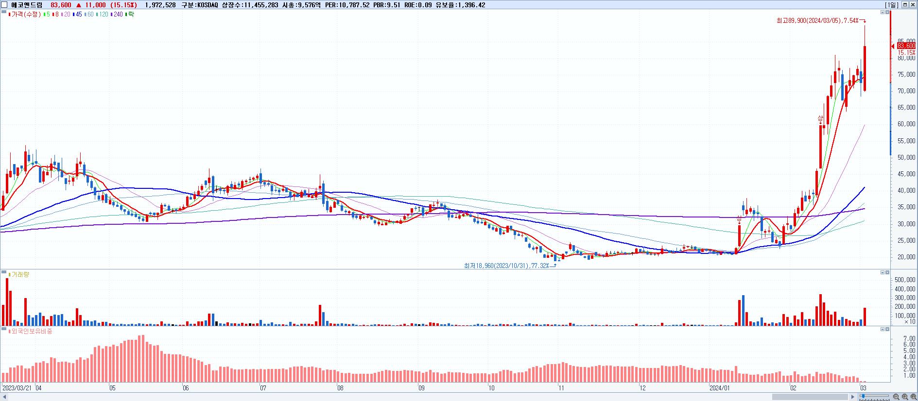 - 에코앤드림 (83,600원 ▲ 15.15% , 시총: 9,577억, 거래량: 1,972,528, 거래대금:1,639억)