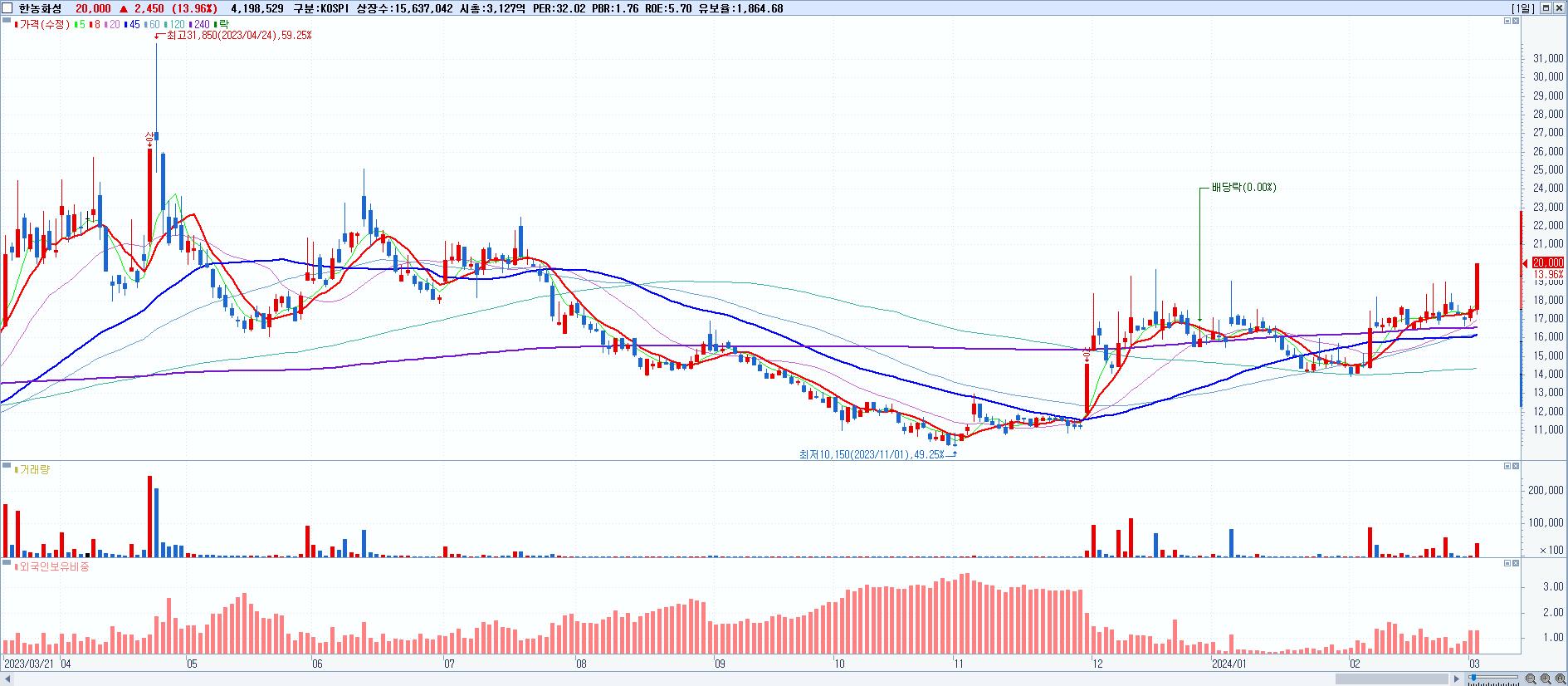 - 한농화성 (20,000원 ▲ 13.96% , 시총: 3,127억, 거래량: 4,198,529, 거래대금:788억)