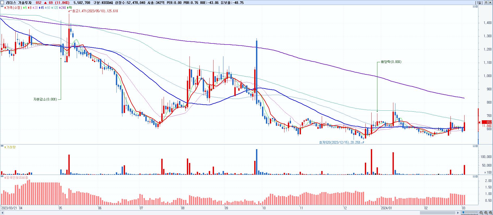 - 리더스 기술투자 (652원 ▲ 11.84% , 시총: 342억, 거래량: 5,502,708, 거래대금:36억)