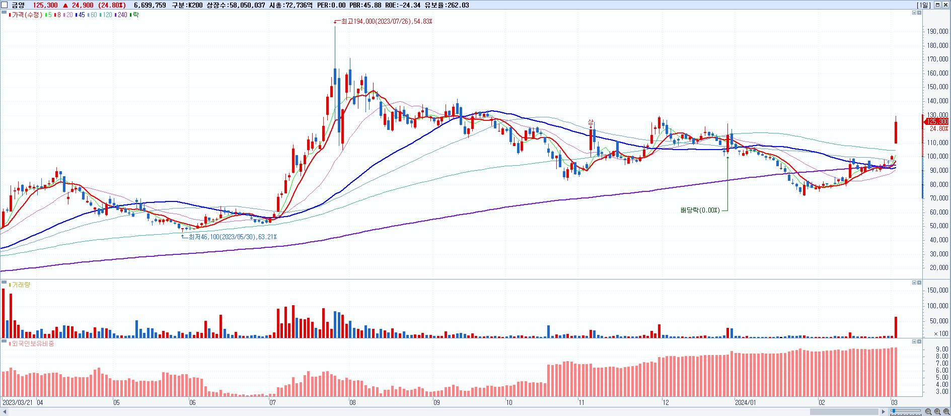- 금양 (125,300원 ▲ 24.8% , 시총: 72,737억, 거래량: 6,699,759, 거래대금:8,153억)