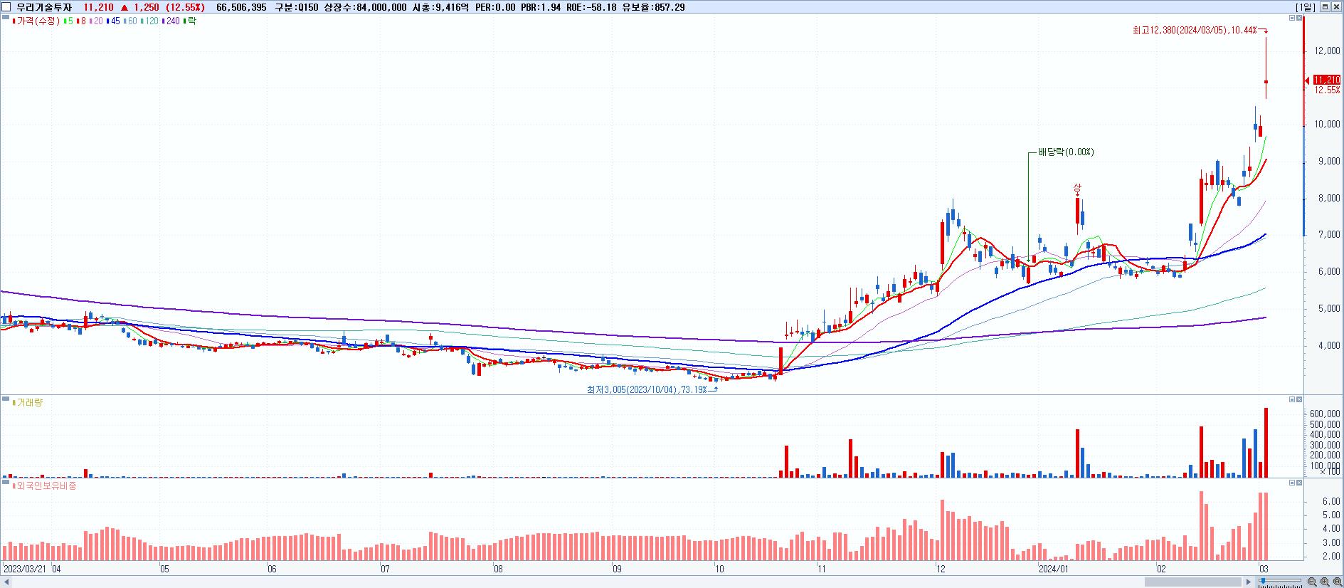 - 우리기술투자 (11,210원 ▲ 12.55% , 시총: 9,416억, 거래량: 66,506,395, 거래대금:7,714억)