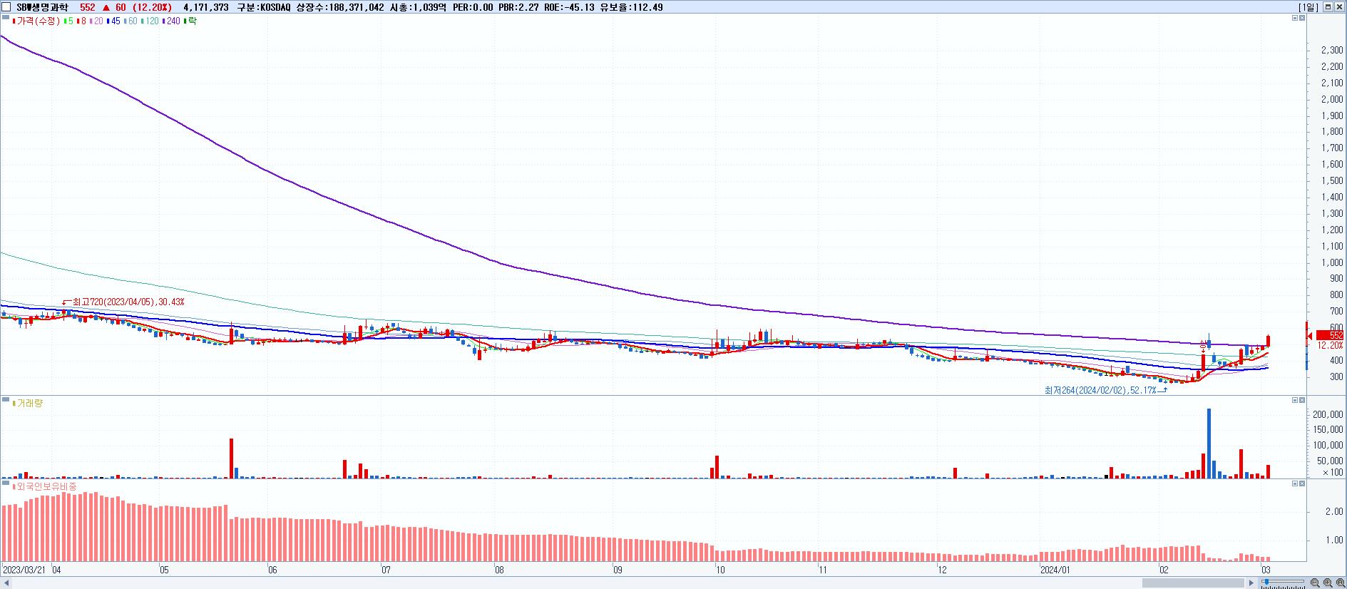 - SBW생명과학 (552원 ▲ 12.2% , 시총: 1,040억, 거래량: 4,171,373, 거래대금:22억)