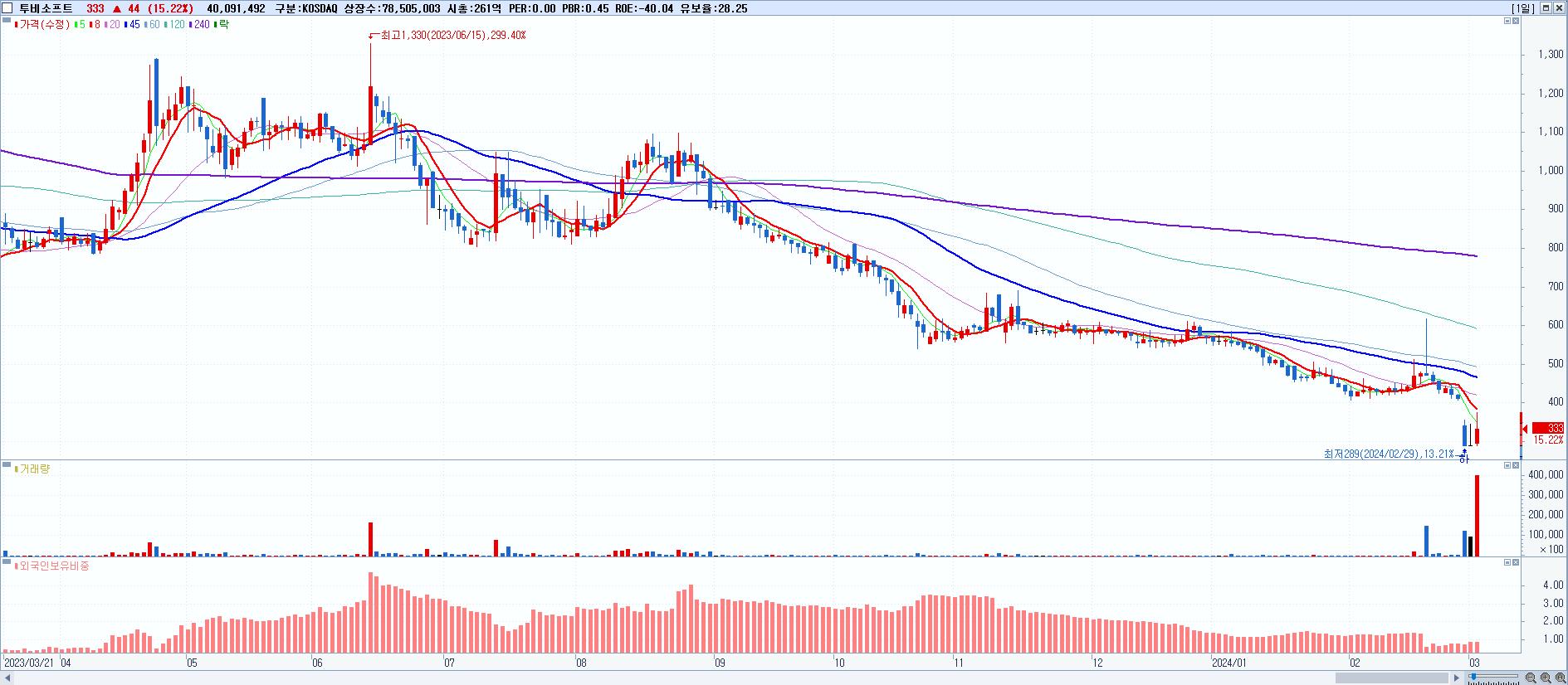 - 투비소프트 (333원 ▲ 15.22% , 시총: 261억, 거래량: 40,091,492, 거래대금:140억)