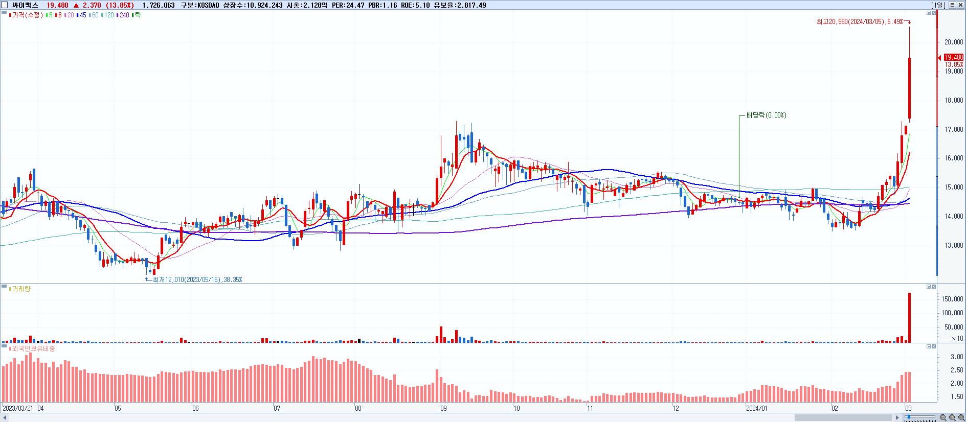 - 싸이맥스 (19,480원 ▲ 13.85% , 시총: 2,128억, 거래량: 1,726,063, 거래대금:335억)