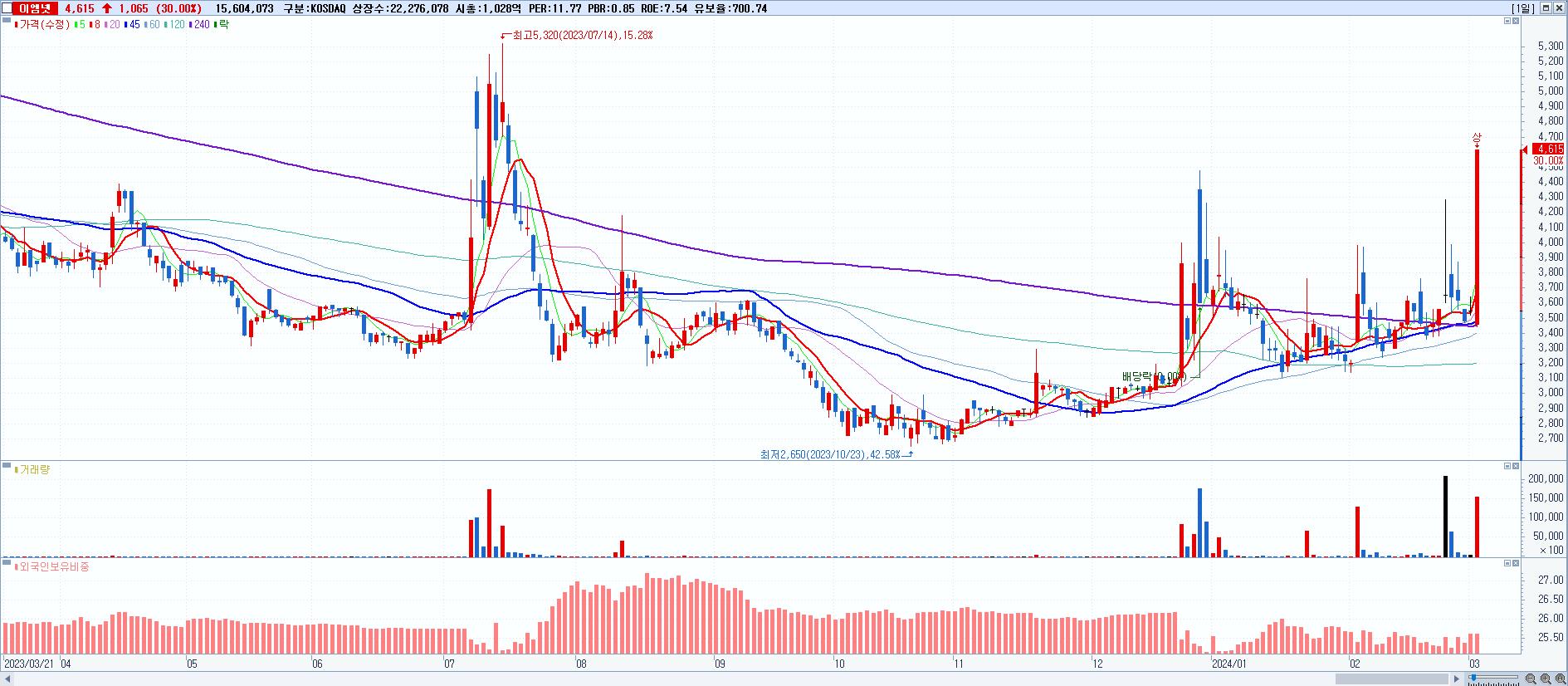 2.이엠넷 4,615원 ▲ 30% (KOSDAQ, 123570)