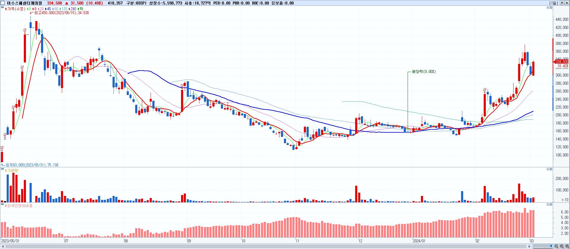 - 이수스페셜티케미컬 (334,500원 ▲ 10.4% , 시총: 18,728억, 거래량: 418,357, 거래대금:1,345억)