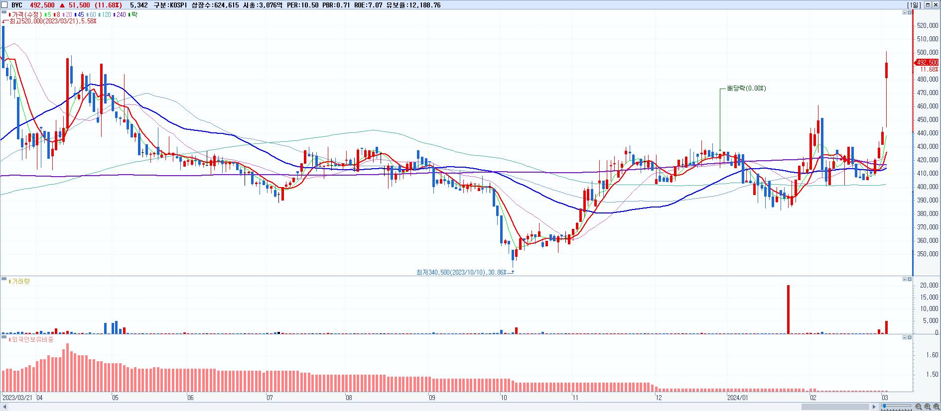 - BYC (492,500원 ▲ 11.68% , 시총: 3,076억, 거래량: 5,342, 거래대금:25억)