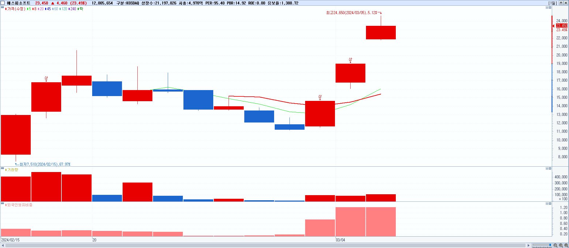 - 에스피소프트 (23,450원 ▲ 23.49% , 시총: 4,971억, 거래량: 12,005,654, 거래대금:2,835억)