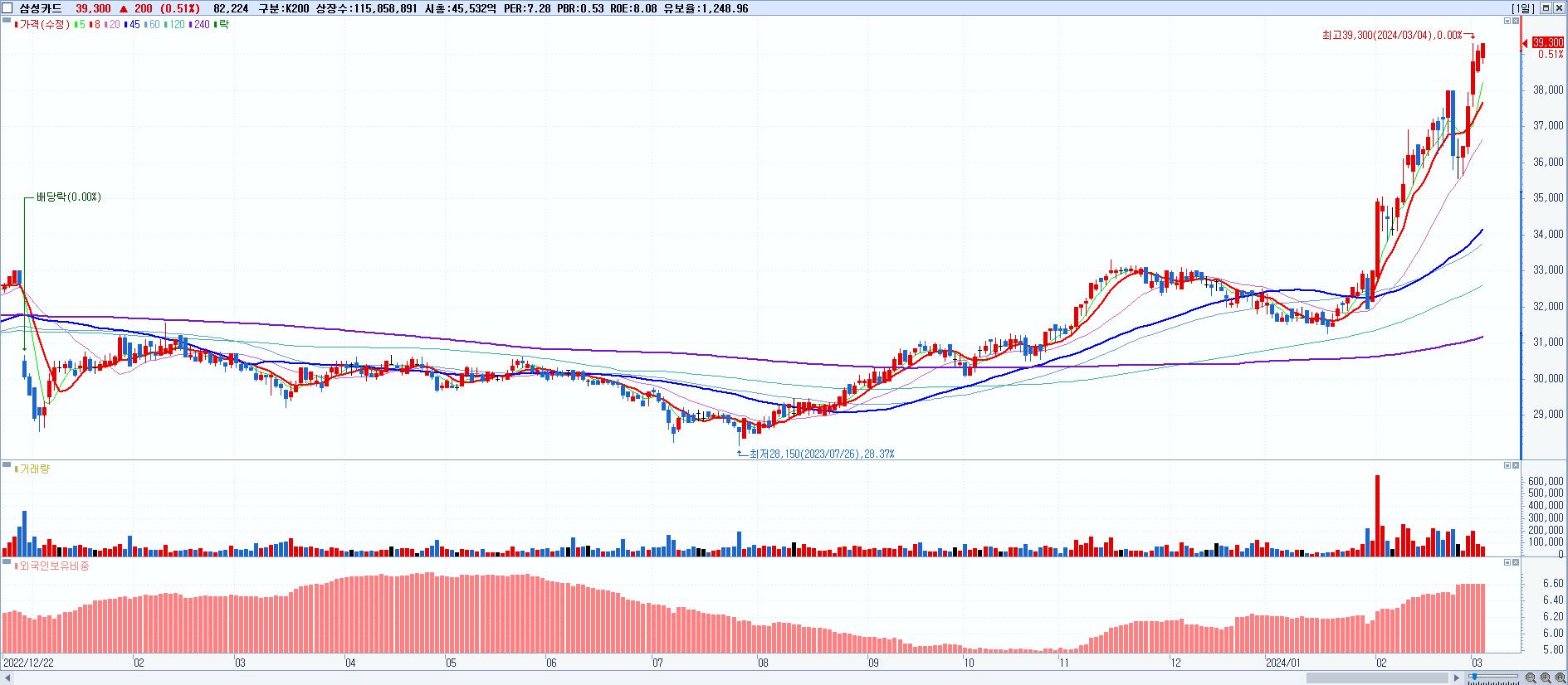 - 삼성카드 (39,300원 ▲ 0.51% , 시총: 45,533억, 거래량: 82,225, 거래대금:32억, KOSPI)