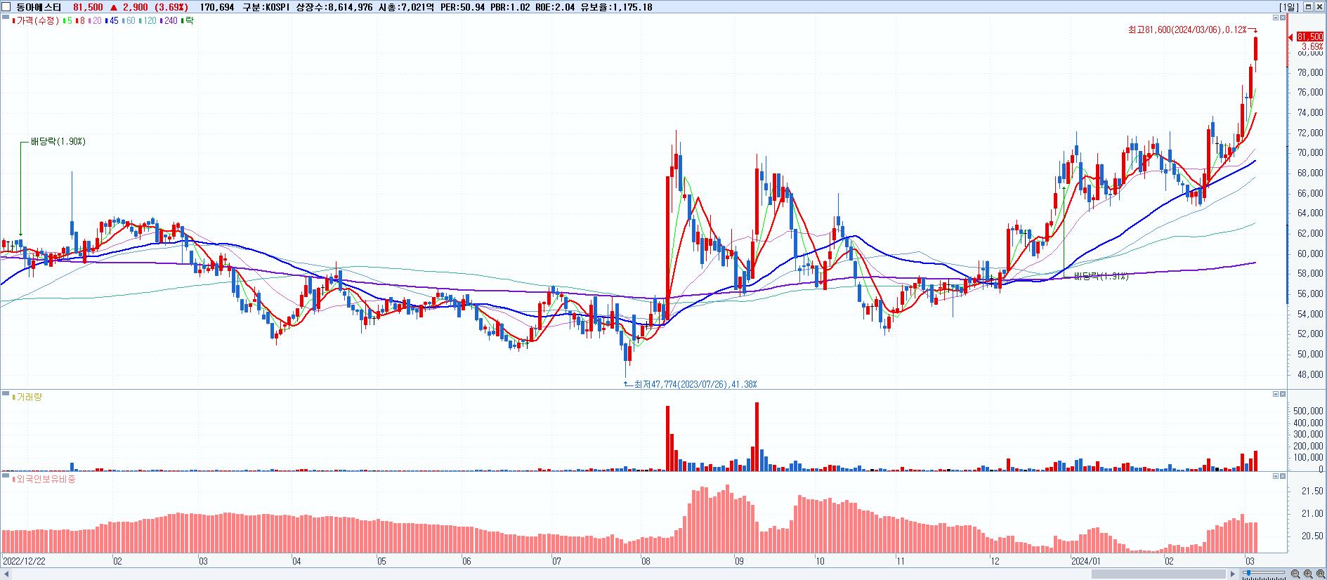 - 동아에스티 (81,500원 ▲ 3.69% , 시총: 7,021억, 거래량: 170,809, 거래대금:137억, KOSPI)