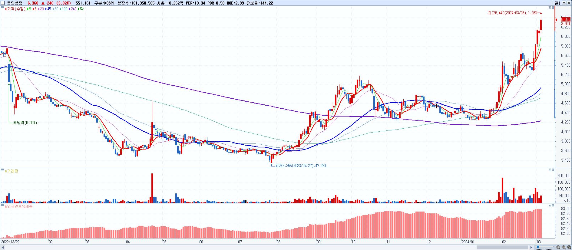 - 동양생명 (6,360원 ▲ 3.92% , 시총: 10,262억, 거래량: 551,165, 거래대금:35억, KOSPI)