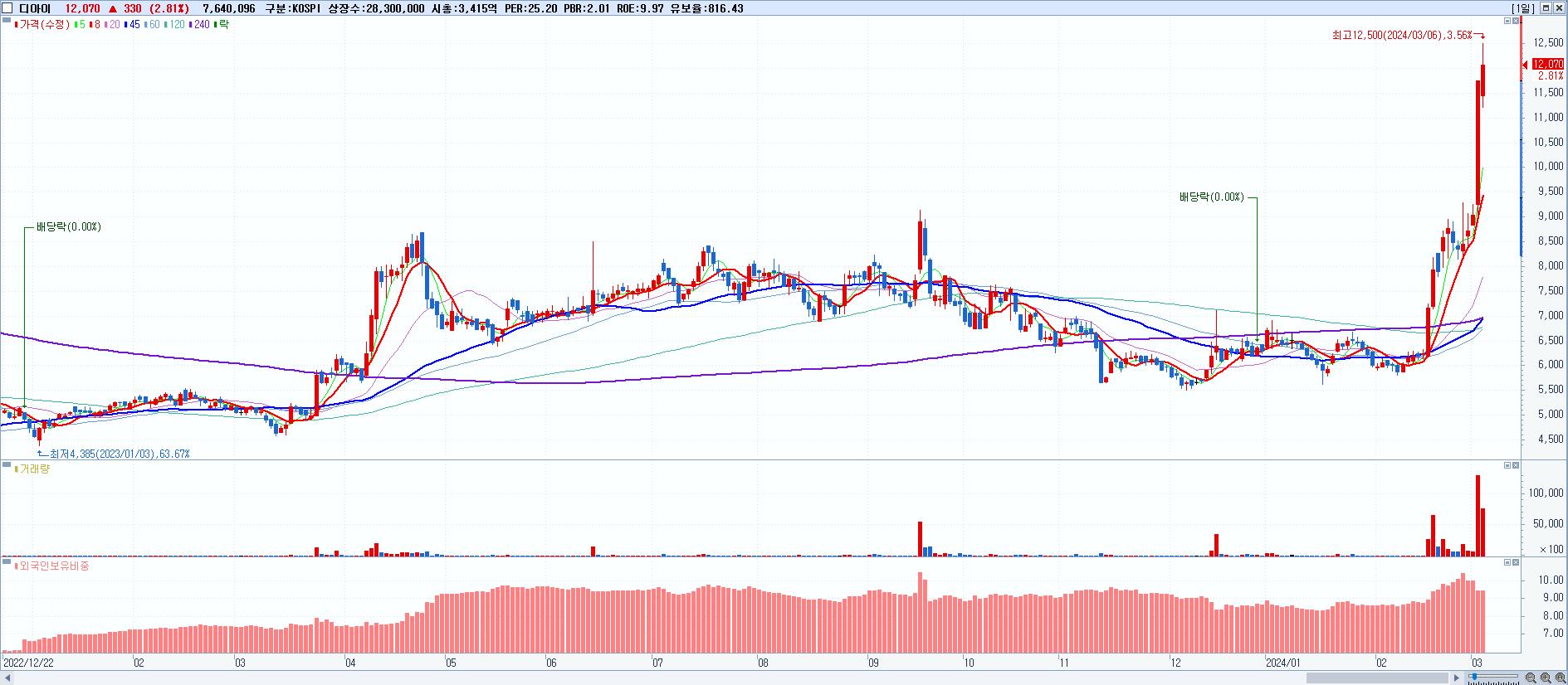 - 디아이 (12,070원 ▲ 2.81% , 시총: 3,416억, 거래량: 7,669,231, 거래대금:908억, KOSPI)