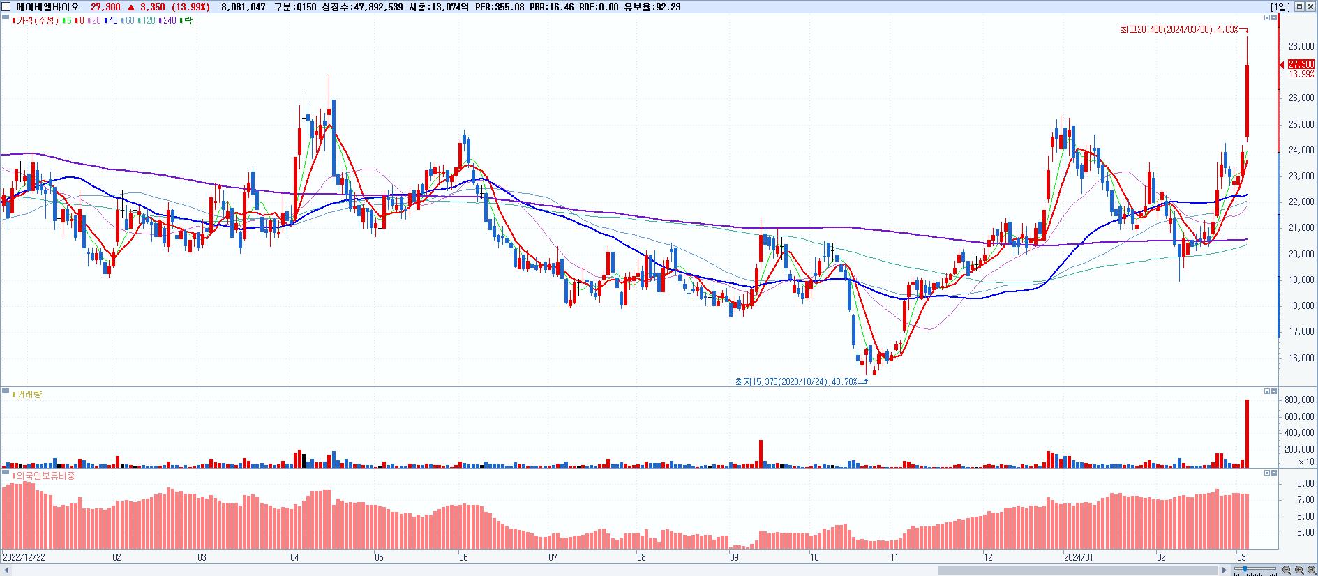 시총: 21,821억 거래량: 13,077,666 거래대금:9,315억