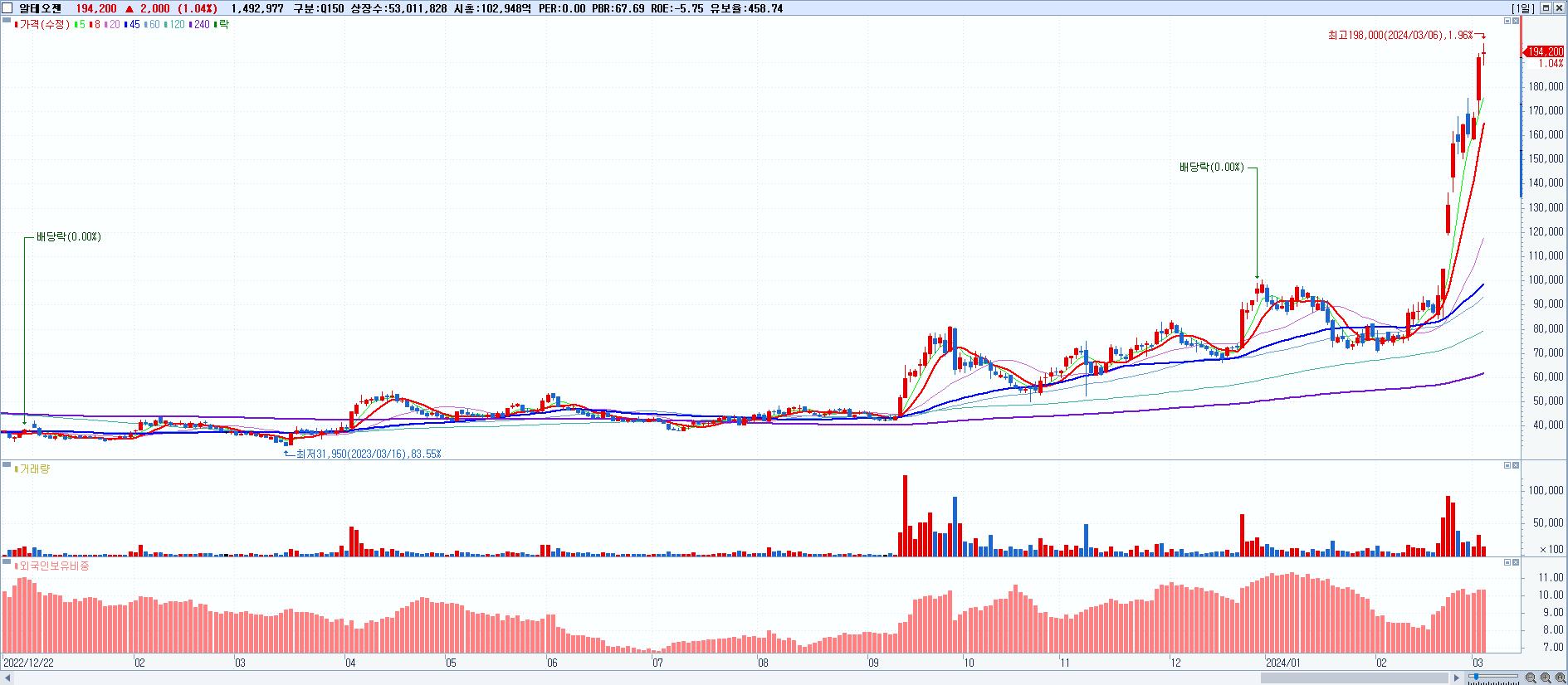 - 알테오젠 (194,200원 ▲ 1.04% , 시총: 102,949억, 거래량: 1,494,993, 거래대금:2,891억, KOSDAQ)