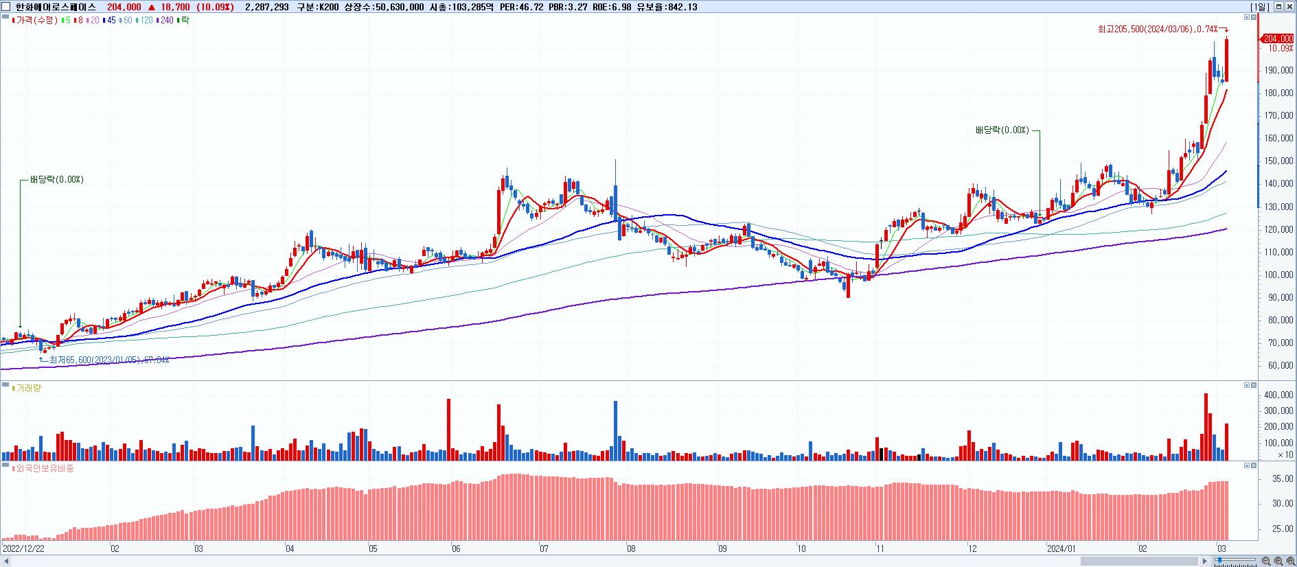 - 한화에어로스페이스 (204,000원 ▲ 10.09% , 시총: 103,285억, 거래량: 2,288,431, 거래대금:4,540억, KOSPI)