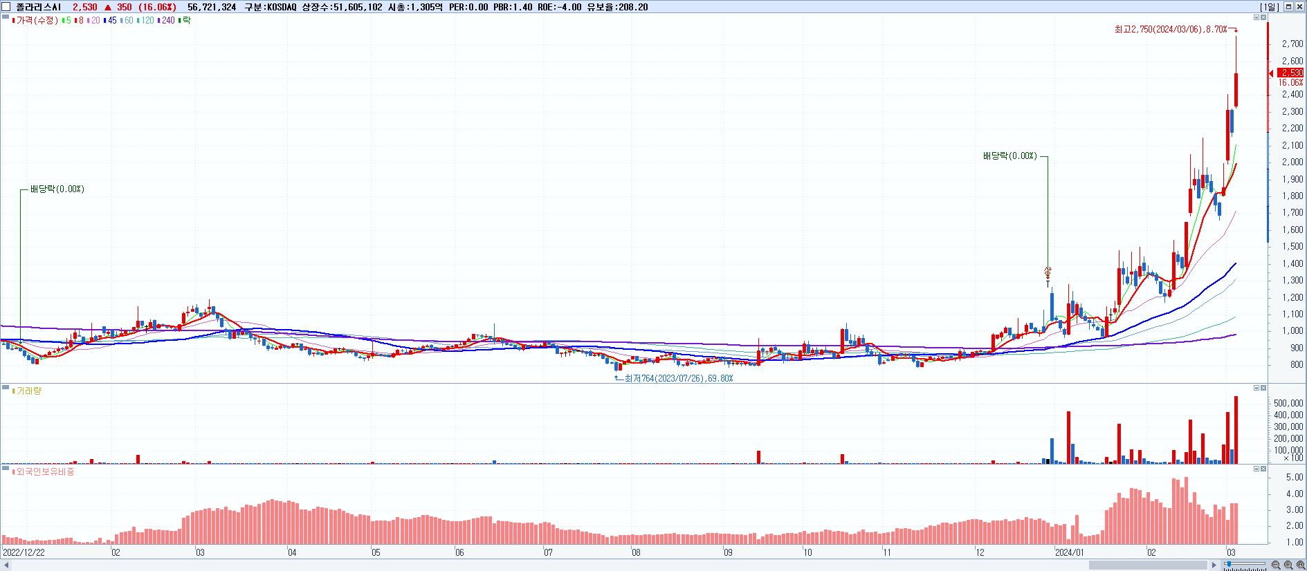 - 폴라리스AI (2,530원 ▲ 16.06% , 시총: 1,306억, 거래량: 56,776,113, 거래대금:1,459억, KOSDAQ)