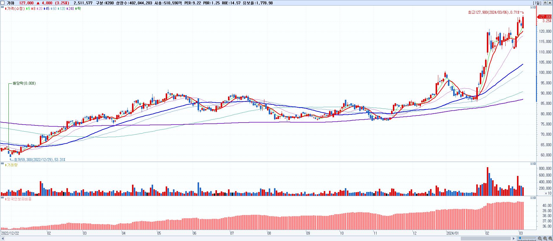 - 기아 (127,000원 ▲ 3.25% , 시총: 510,596억, 거래량: 2,535,208, 거래대금:3,174억, KOSPI)