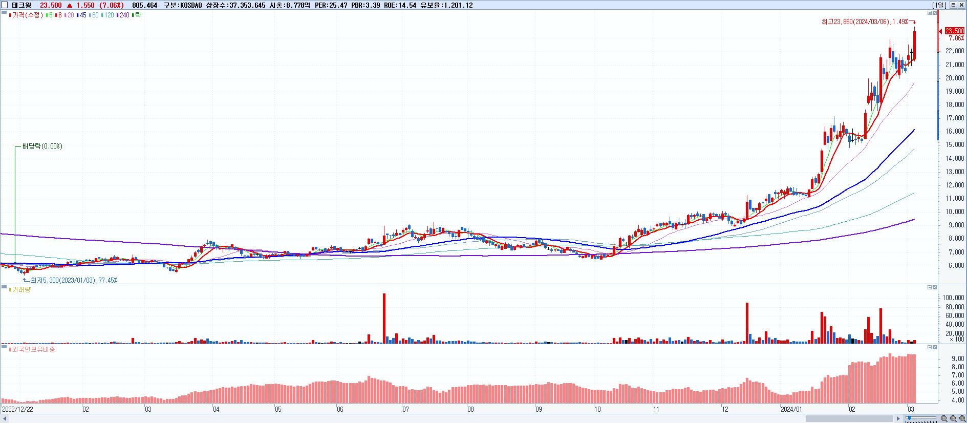 - 테크윙 (23,500원 ▲ 7.06% , 시총: 8,778억, 거래량: 805,685, 거래대금:184억, KOSDAQ)