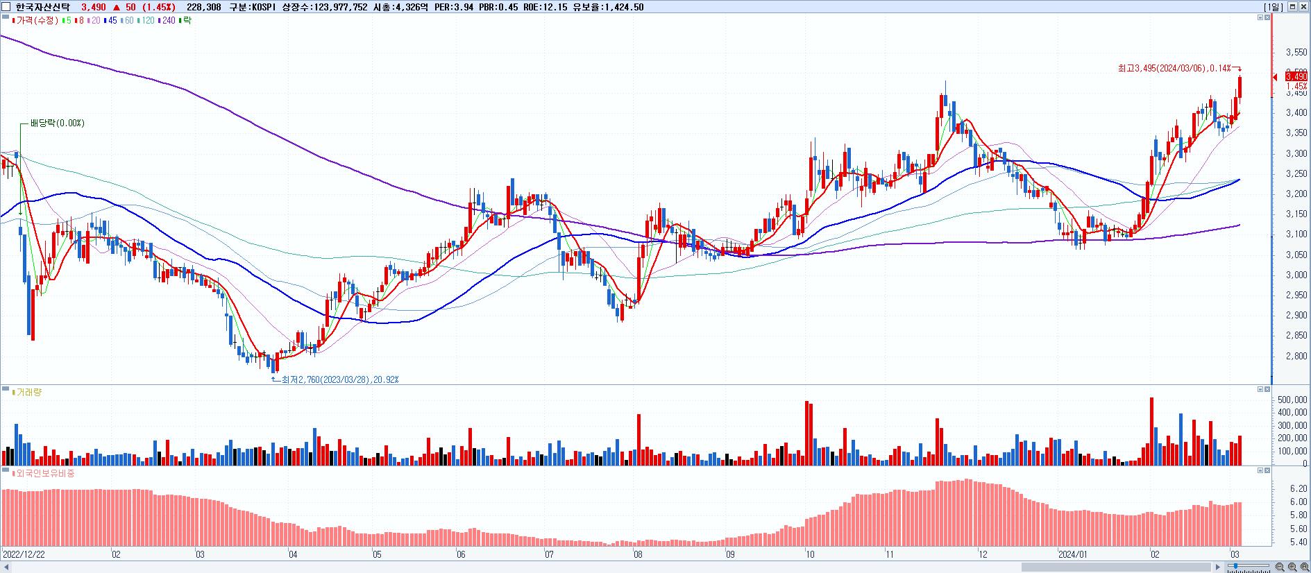 - 한국자산신탁 (3,490원 ▲ 1.45% , 시총: 4,327억, 거래량: 228,336, 거래대금:8억, KOSPI)