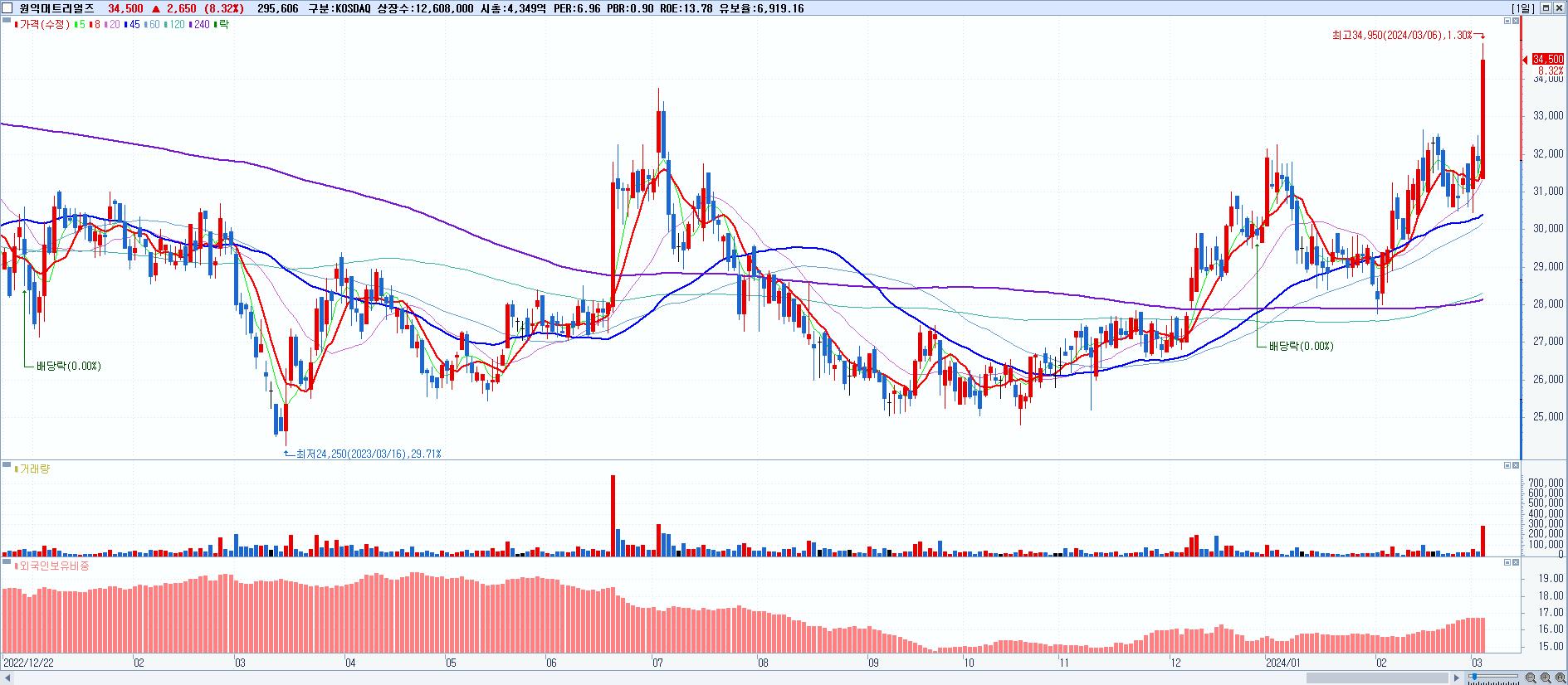 - 원익머트리얼즈 (34,500원 ▲ 8.32% , 시총: 4,350억, 거래량: 295,630, 거래대금:101억, KOSDAQ)