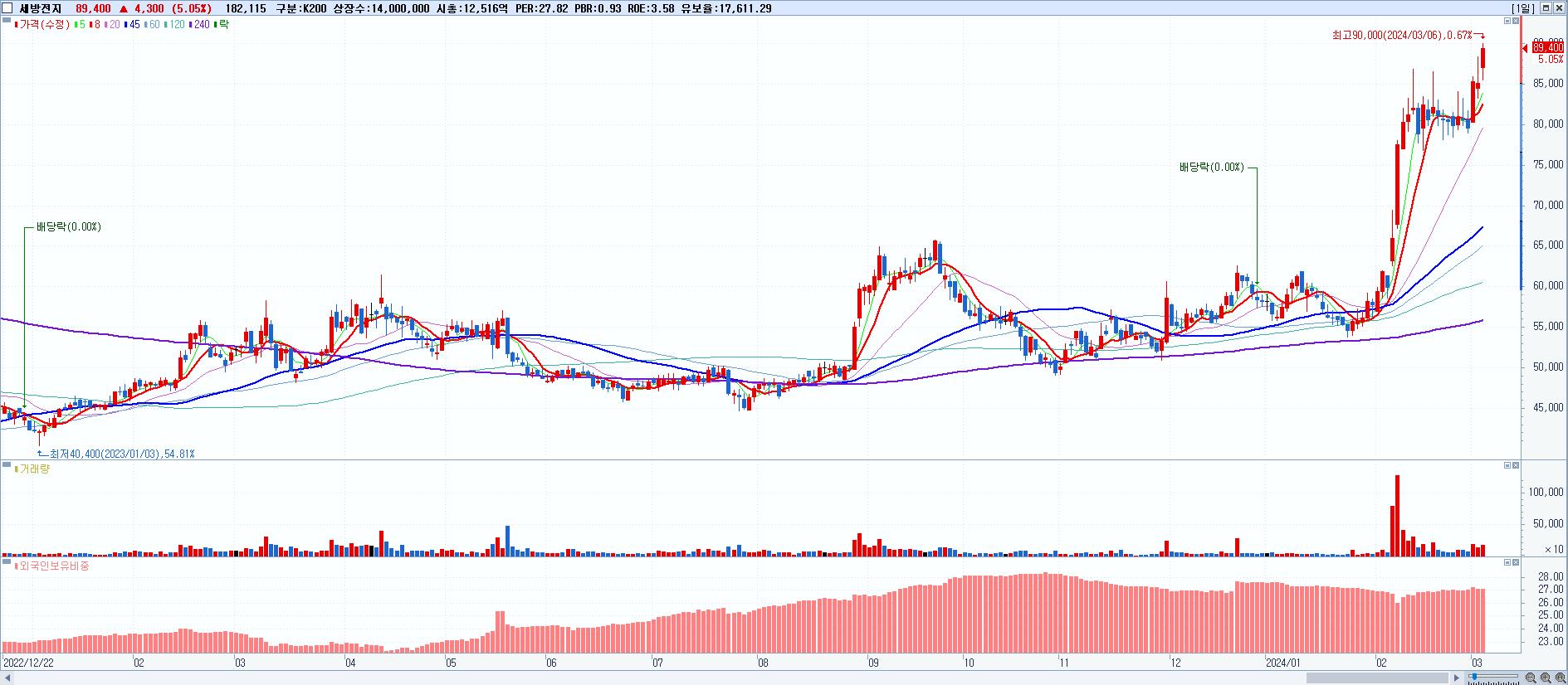 - 세방전지 (89,400원 ▲ 5.05% , 시총: 12,516억, 거래량: 182,134, 거래대금:161억, KOSPI)