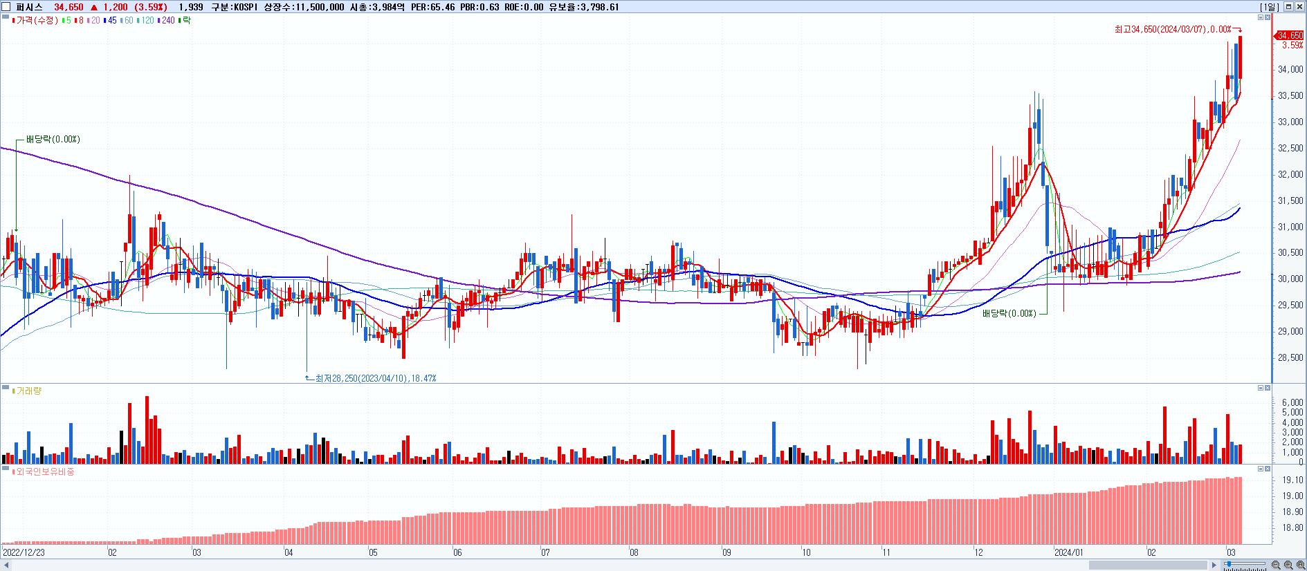 - 퍼시스 (34,650원 ▲ 3.59% , 시총: 3,985억, 거래량: 1,939, 거래대금:1억, KOSPI)