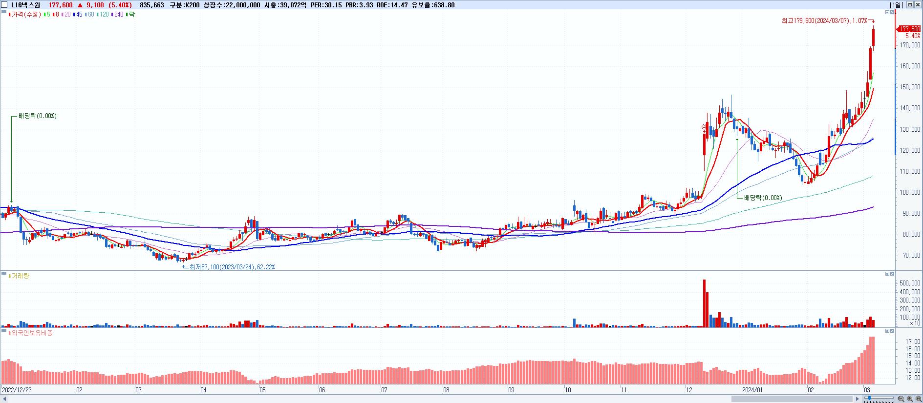 - LIG넥스원 (177,600원 ▲ 5.4% , 시총: 39,072억, 거래량: 835,663, 거래대금:1,451억, KOSPI)