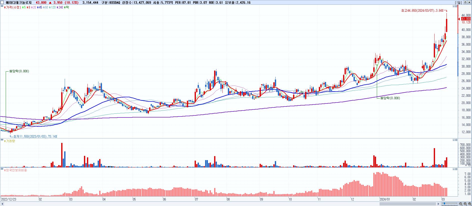 - 에이디테크놀로지 (43,000원 ▲ 10.12% , 시총: 5,774억, 거래량: 3,154,444, 거래대금:1,332억, KOSDAQ)