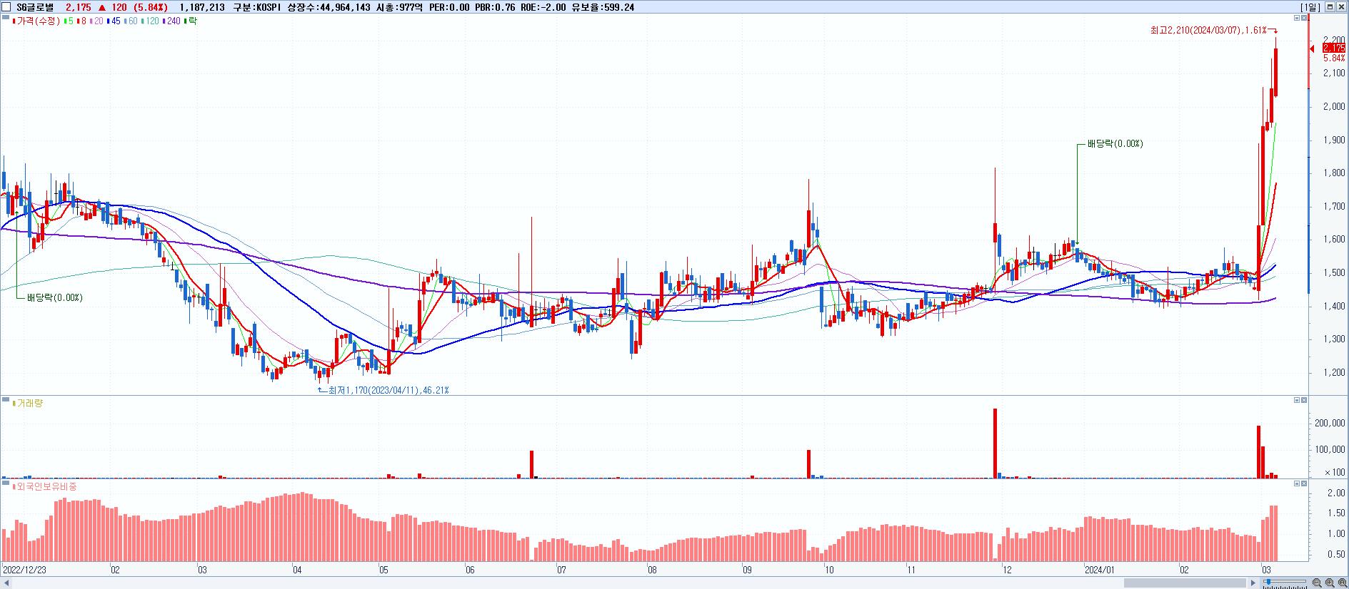 - SG글로벌 (2,175원 ▲ 5.84% , 시총: 978억, 거래량: 1,187,213, 거래대금:25억, KOSPI)