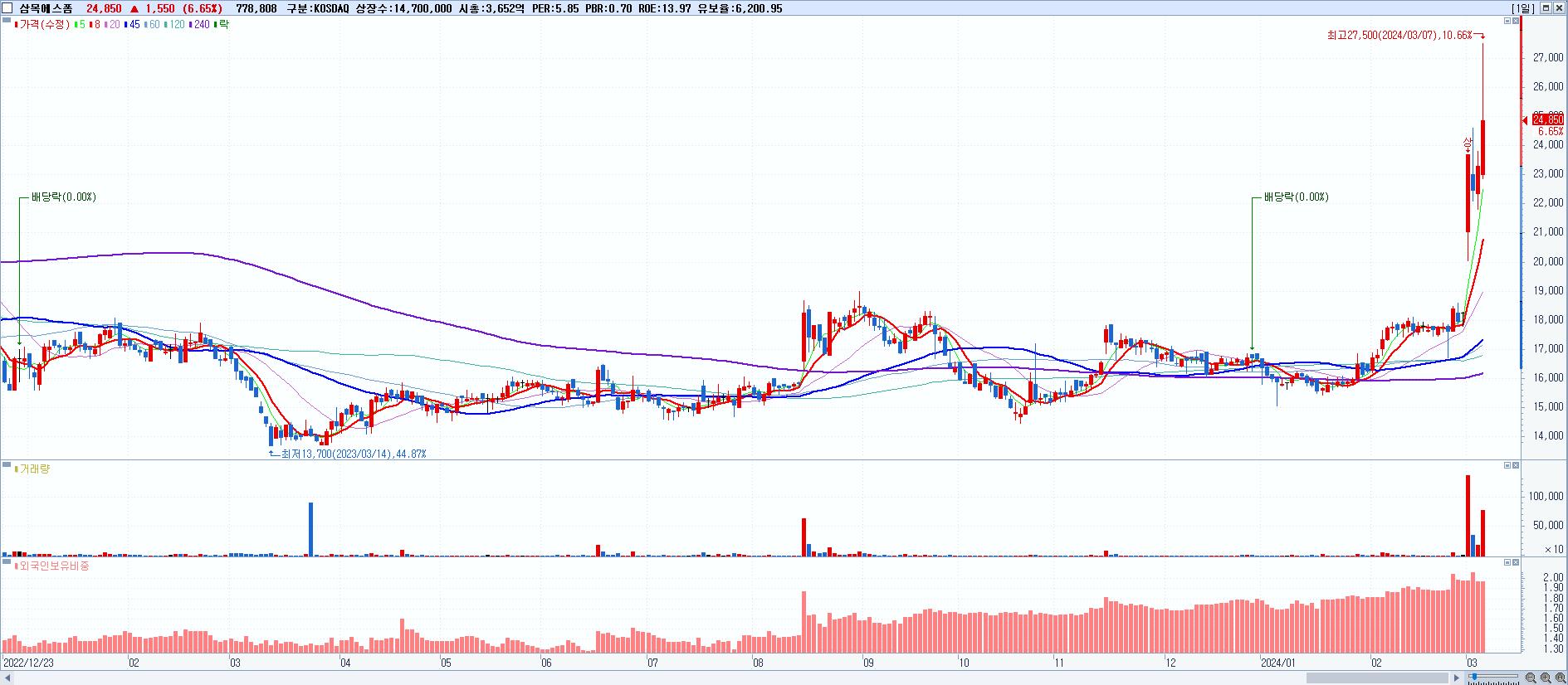 - 삼목에스폼 (24,850원 ▲ 6.65% , 시총: 3,653억, 거래량: 778,808, 거래대금:201억, KOSDAQ)