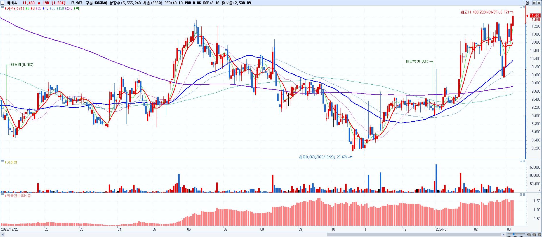 - 비비씨 (11,460원 ▲ 1.69% , 시총: 637억, 거래량: 17,987, 거래대금:2억, KOSDAQ)