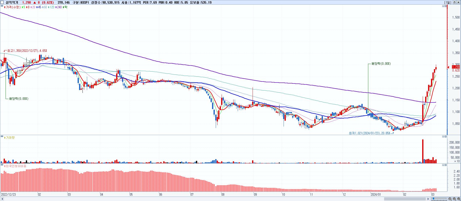 - 삼익악기 (1,290원 ▲ 0.62% , 시총: 1,168억, 거래량: 370,146, 거래대금:5억, KOSPI)
