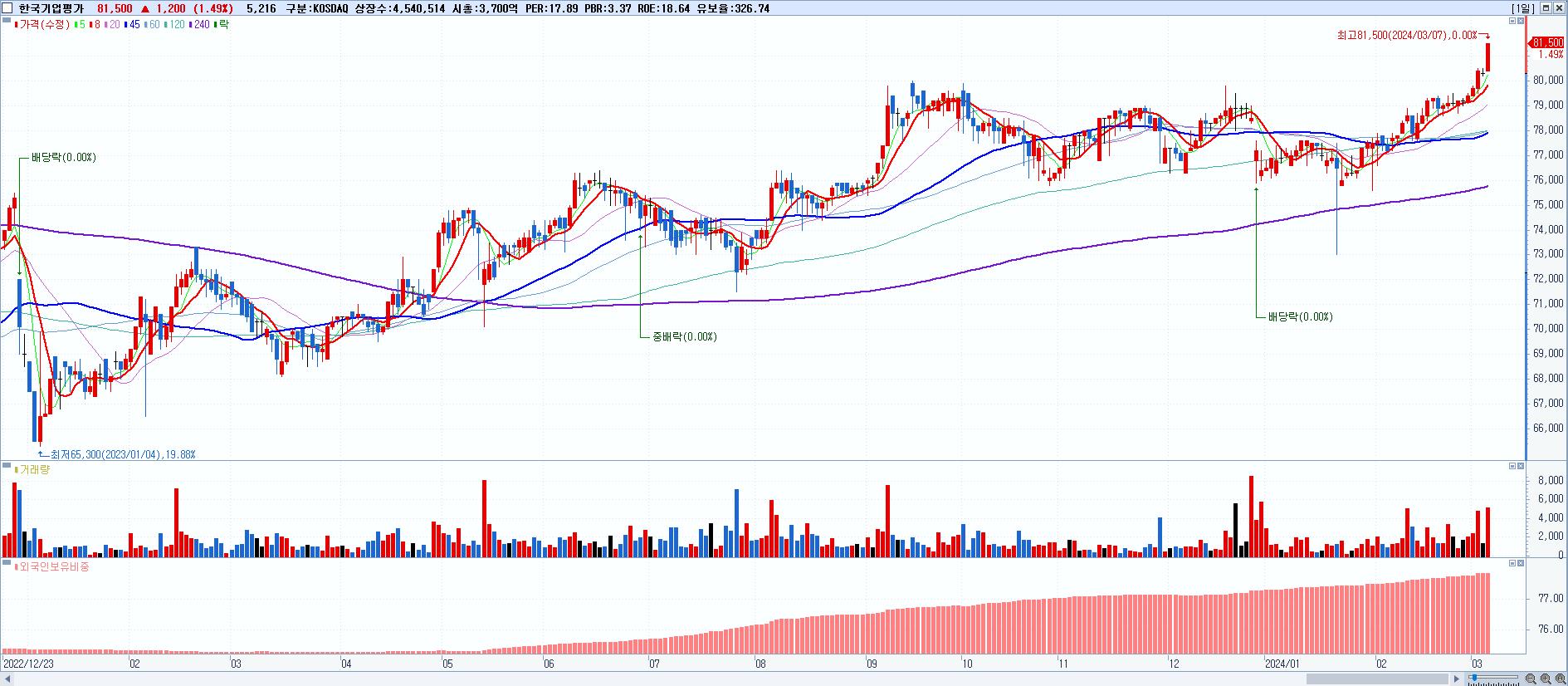 - 한국기업평가 (81,500원 ▲ 1.49% , 시총: 3,701억, 거래량: 5,216, 거래대금:4억, KOSDAQ)