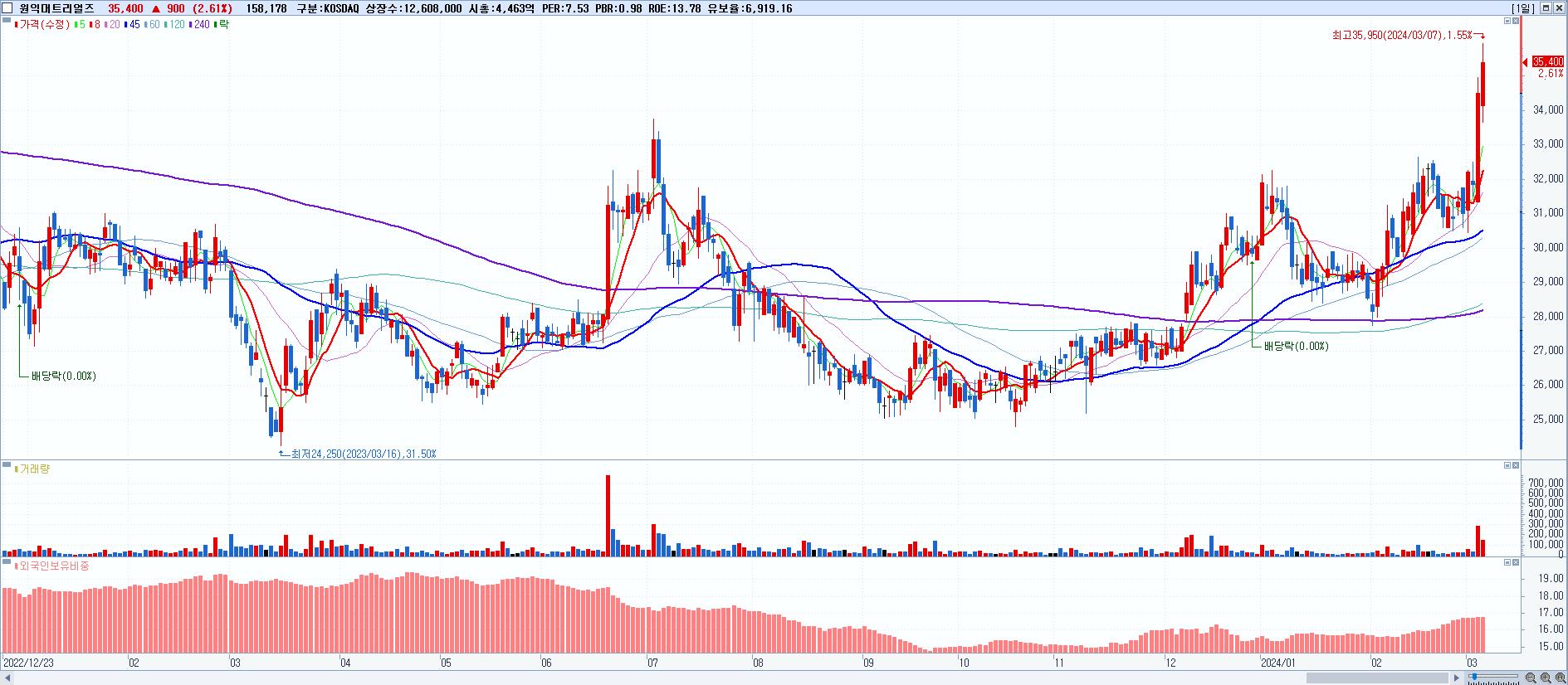 - 원익머트리얼즈 (35,400원 ▲ 2.61% , 시총: 4,463억, 거래량: 158,178, 거래대금:56억, KOSDAQ)