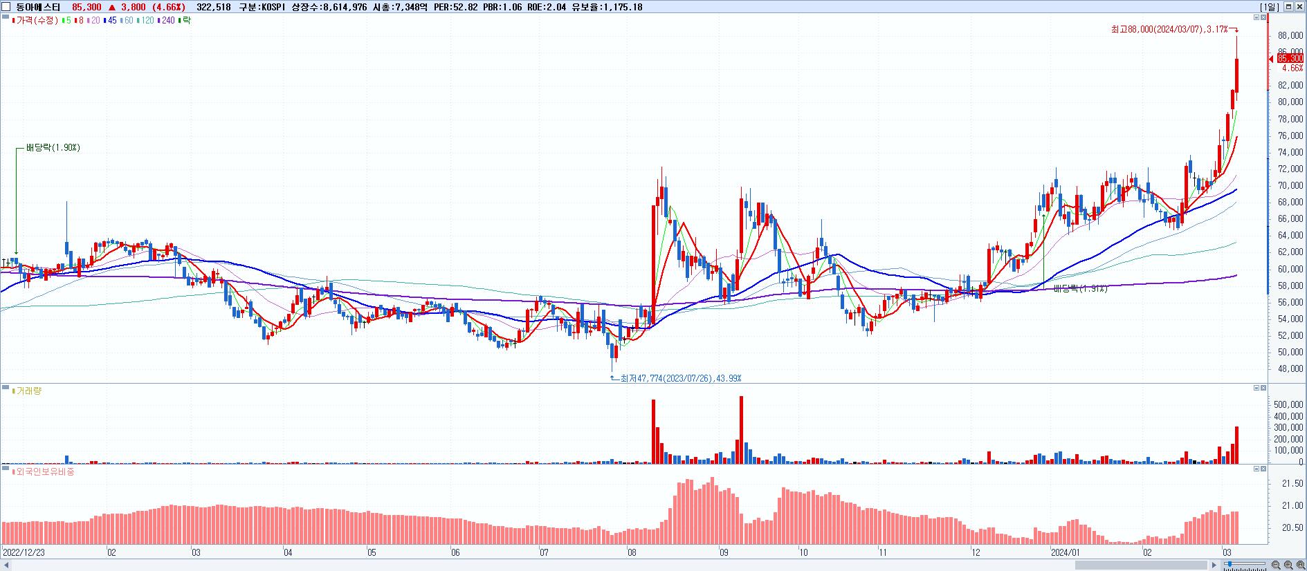 - 동아에스티 (85,300원 ▲ 4.66% , 시총: 7,349억, 거래량: 322,518, 거래대금:275억, KOSPI)