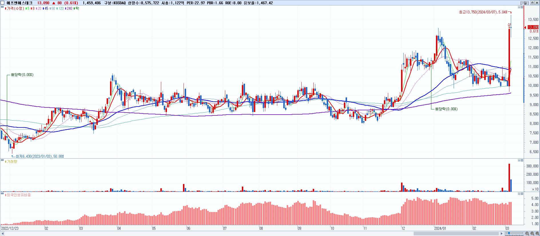 - 에프엔에스테크 (13,090원 ▲ 0.61% , 시총: 1,123억, 거래량: 1,459,406, 거래대금:192억, KOSDAQ)